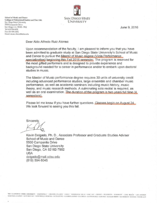 Mi nombre es Aldo Alfredo Ruiz Alonso, tengo 24 años y soy Licenciado en Música con especialidad en Viola por la Universidad Autónoma de Baja California. Me dirijo a usted para solicitar su generoso apoyo económico para la realización de mis estudios de Maestría en Música, con especialidad en ejecución de Viola, en San Diego State University.